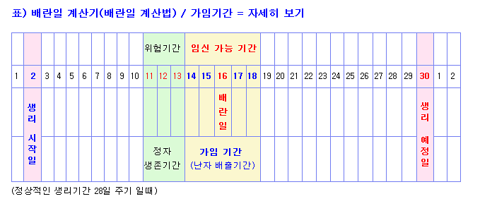 생리주기계산만 검색하시면 자동계산기가 뜹니다. 월경주기가 30일이면 더 정확하고 월경이 1일에 시작되면 다음 월경 예정일도 다음 달 1일입니다. 그렇다면 배란일은 언제일까요? 배란일은 17일째, 출산 예정일의 14일째! 가임력은 배란 전 13일~18일, 배란 전 3일~4일, 배란 후 1일에 산정합니다.