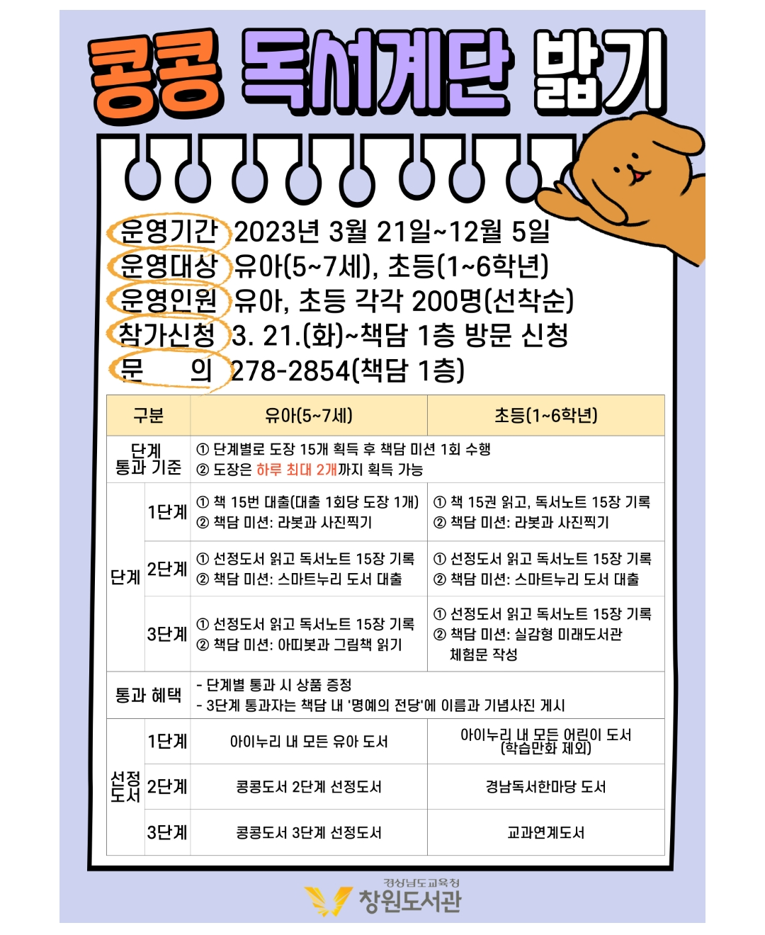 두 번째는 어린 자녀를 둔 부모들에게 희소식입니다. 2022년에는 도서관의 여러 사정으로 인해 취소되었던 행사였습니다. “2023년 콩콩 독서계단 진입”입니다.