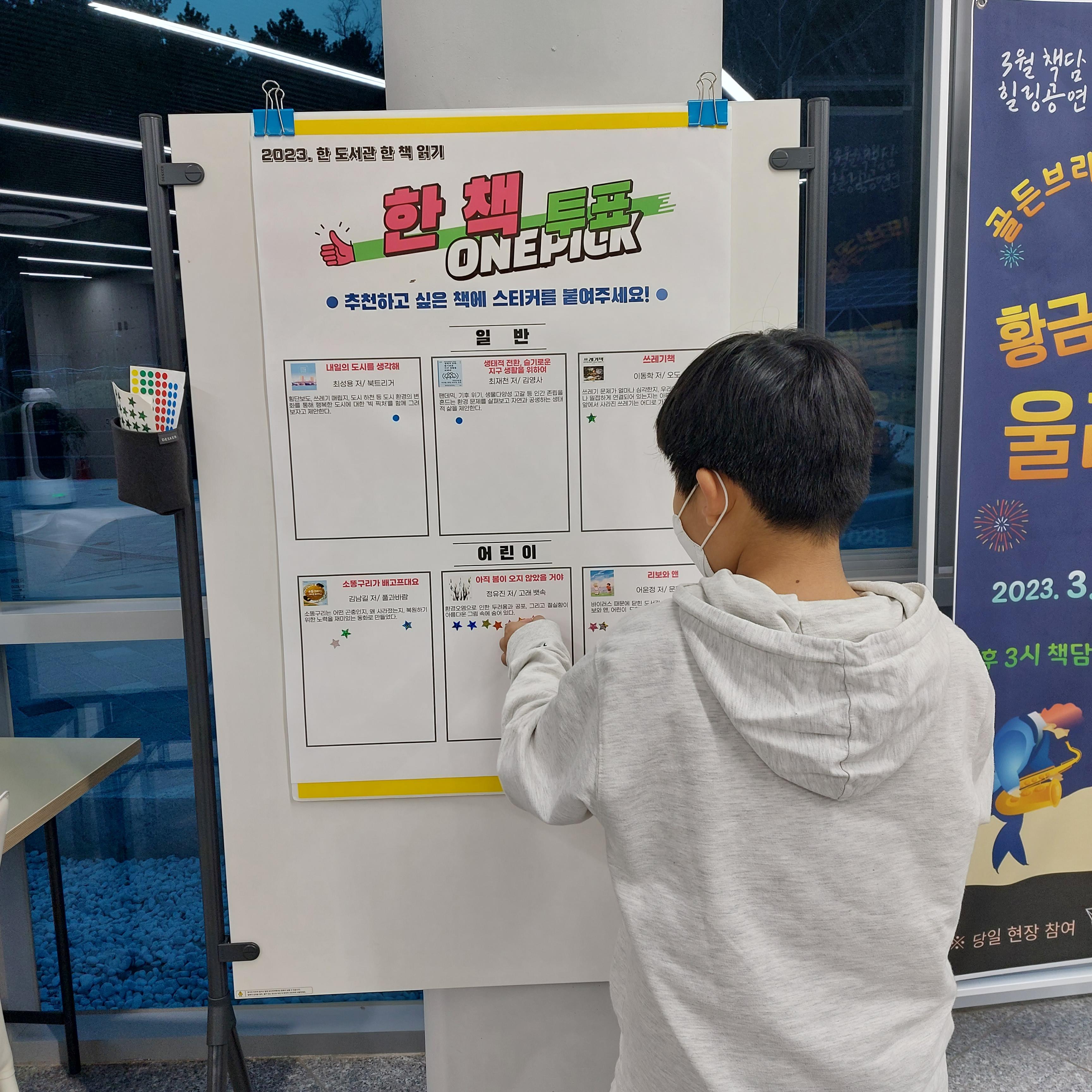 현재 도서관에서 책을 읽을 수 있는 후보도서 중 읽고 싶은 책에 스티커를 붙이는 작업을 진행하고 있습니다.