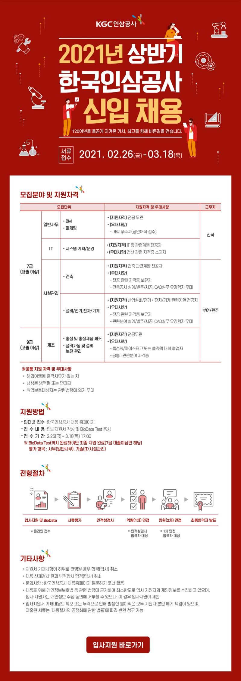 한국인삼공사 채용절차 “지원/생물학적 정보검사-서류전형-인적성검사-1차(적성)면접-2차(임원)면접-최종합격”