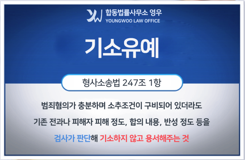 친고죄나 반의사불벌죄 규정이 적용되는 범행이 아닌 죄를 범한 경우에는 해당 처분을 받는 것이 가장 최선일 수 있습니다. 하지만 검찰로부터 해당 처분을 받기는 상당히 쉽지 않을 수 있습니다. 먼저 범행 내용/정도가 심각하지 않았습니다. 범행 정도가 심각한 경우 중범죄에 해당하는 범행을 저지른 경우에는 어떤 노력을 가하더라도 해당 처분을 받을 가능성이 현저히 낮습니다. 거의 불가능하다고 봐도 무방합니다. 그리고 이전 동종의 범죄를 저지른 적이 있는 경우 역시 해당 처분을 받기가 매우 어렵습니다. 그러나 이러한 경우가 아니라면 심각한 범죄 사건이 아닌 경우, 범행 정도가 그리 무겁지 않은 경우, 이전 동종의 범행을 저지른 적이 없는 경우라면 해당 처분을 기대할 수 있습니다.검찰이 피의자에게 해당 처분을 내릴 것인가를 결정할 때에는 위 내용, 범행내용/범행정도 및 범행경위 및 범행후 정황, 또 피의자가 동종 전과가 있는지, 그리고 피의자가 범행을 저지른 것에 대해 반성하고 있는지, 피해자가 존재하는 사건의 경우 피의자가 범행에 응하여 피해자가 입은 피해회복을 위해 노력했는지, 피의자가 피해자에 대한 처벌을 원하지 않는지, 피고인의 나이*지능·피의자가 성행하는지를 고려합니다. 이러한 부분으로 인해 형량 감경에 유리한 상황*조건을 극대화할 수 있도록 해야 하며 죄질이 불량해질 수 있는 부분에 대해서는 현명하게 방어해야 합니다. 그리고 피해자와 존재하는 사건, 특히 성과 관련된 범죄 사건에서는 피해자와 원만한 합의를 얻어야 합니다.다른 형사법적 처분을 받는 경우 기소유예 전과기록이 남지 않는 처분을 받는 경우와 달리벌금형 이상의 형을 선고받은 경우 성범죄 경력 자료에 기재되어 수사기관에서 평생 관리됩니다. 또한 성과 관련된 범죄자로 관할 경찰서에 등록해야 하는데(벌금형 기준 최소 10년) 개인정보가 변경될 때마다 이를 관할서에 알려야 하며 사진은 매년 관할서에 출석하여 재촬영하여야 합니다. 이러한 의무를 위반한 경우에는 관련 규정에 따른 처분을 별도로 받을 수 있습니다. 또한, 사건/상황에 따라 개인정보공개명령/아동청소년 관련기관 취업제한명령/전자장치 부착명령/보호관찰명령을 받을 수 있습니다. 참고로 개인정보 등록명령을 제외한 처분에 대해서는 이의신청이 가능합니다.형사법적 사건에 연루된 경우비슷하고 유사한 사건이라도 어떤 형사전문 법률대리인과 함께 하느냐에 따라 사건의 결과는 달라질 수 있습니다. 형사법적 사건과 관련하여 최선의 대책이 필요한 분, 형사사법기관의 선처를 구하고 기소유예 전과기록이 남지 않는 처분을 받으려는 분, 그리고 해당 처분을 받지 못하더라도 처한 입장과 상황에서 받을 수 있는 최선의 결과를 얻고자 하는 분은 성과에 관한 범죄사건 및 형사사건 범죄해결 노하우를 보유한 뛰어난 능력을 갖춘 베테랑 형사전문 법률대리인의 도움을 구할 것을 권합니다.비슷하고 유사한 사건이라도 어떤 형사전문 법률대리인과 함께 하느냐에 따라 사건의 결과는 달라질 수 있습니다. 형사법적 사건과 관련하여 최선의 대책이 필요한 분, 형사사법기관의 선처를 구하고 기소유예 전과기록이 남지 않는 처분을 받으려는 분, 그리고 해당 처분을 받지 못하더라도 처한 입장과 상황에서 받을 수 있는 최선의 결과를 얻고자 하는 분은 성과에 관한 범죄사건 및 형사사건 범죄해결 노하우를 보유한 뛰어난 능력을 갖춘 베테랑 형사전문 법률대리인의 도움을 구할 것을 권합니다.* 사건해결성공사례카메라등을이용한촬영행위 * 준강제추행범행이 인정된 의뢰인에게 기소유예 전과기록이 남지 않는 처분을 도출한 사례로 지인과의 술자리에서 술기운에 성적 충동을 참지 못하고 술에 취해 잠든 여성 지인에게 카메라 등을 이용한 촬영행위를 하고 강제적인 성접촉을 하여 두 가지 혐의로 피소된 의뢰인을 효과적으로 조력하여 해당 처분을 도출한 본 로펌의 성공사례가 궁금하시다면 아래 링크를 클릭하여 그 내용을 확인하시기 바랍니다.* 사건해결성공사례카메라등을이용한촬영행위 * 준강제추행범행이 인정된 의뢰인에게 기소유예 전과기록이 남지 않는 처분을 도출한 사례로 지인과의 술자리에서 술기운에 성적 충동을 참지 못하고 술에 취해 잠든 여성 지인에게 카메라 등을 이용한 촬영행위를 하고 강제적인 성접촉을 하여 두 가지 혐의로 피소된 의뢰인을 효과적으로 조력하여 해당 처분을 도출한 본 로펌의 성공사례가 궁금하시다면 아래 링크를 클릭하여 그 내용을 확인하시기 바랍니다.* 사건해결성공사례카메라등을이용한촬영행위 * 준강제추행범행이 인정된 의뢰인에게 기소유예 전과기록이 남지 않는 처분을 도출한 사례로 지인과의 술자리에서 술기운에 성적 충동을 참지 못하고 술에 취해 잠든 여성 지인에게 카메라 등을 이용한 촬영행위를 하고 강제적인 성접촉을 하여 두 가지 혐의로 피소된 의뢰인을 효과적으로 조력하여 해당 처분을 도출한 본 로펌의 성공사례가 궁금하시다면 아래 링크를 클릭하여 그 내용을 확인하시기 바랍니다.* 사건해결성공사례카메라등을이용