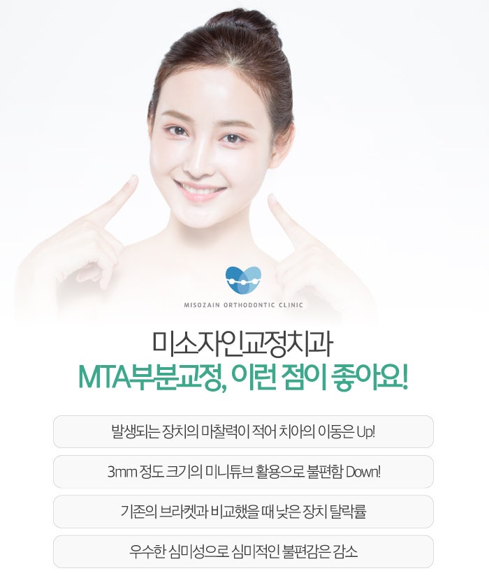 심미적으로 매우 우수하여 앞니 부분 교정에 주로 사용되는 MTA 교정은 3mm 정도 크기의 미니 튜브로 불편함을 더욱 감소시켰습니다.종래 브라켓과 비교해도 장치의 탈락률이 매우 낮기 때문에 효과적이면서도 불편함을 감소시킨 교정치료를 수행할 수 있습니다.