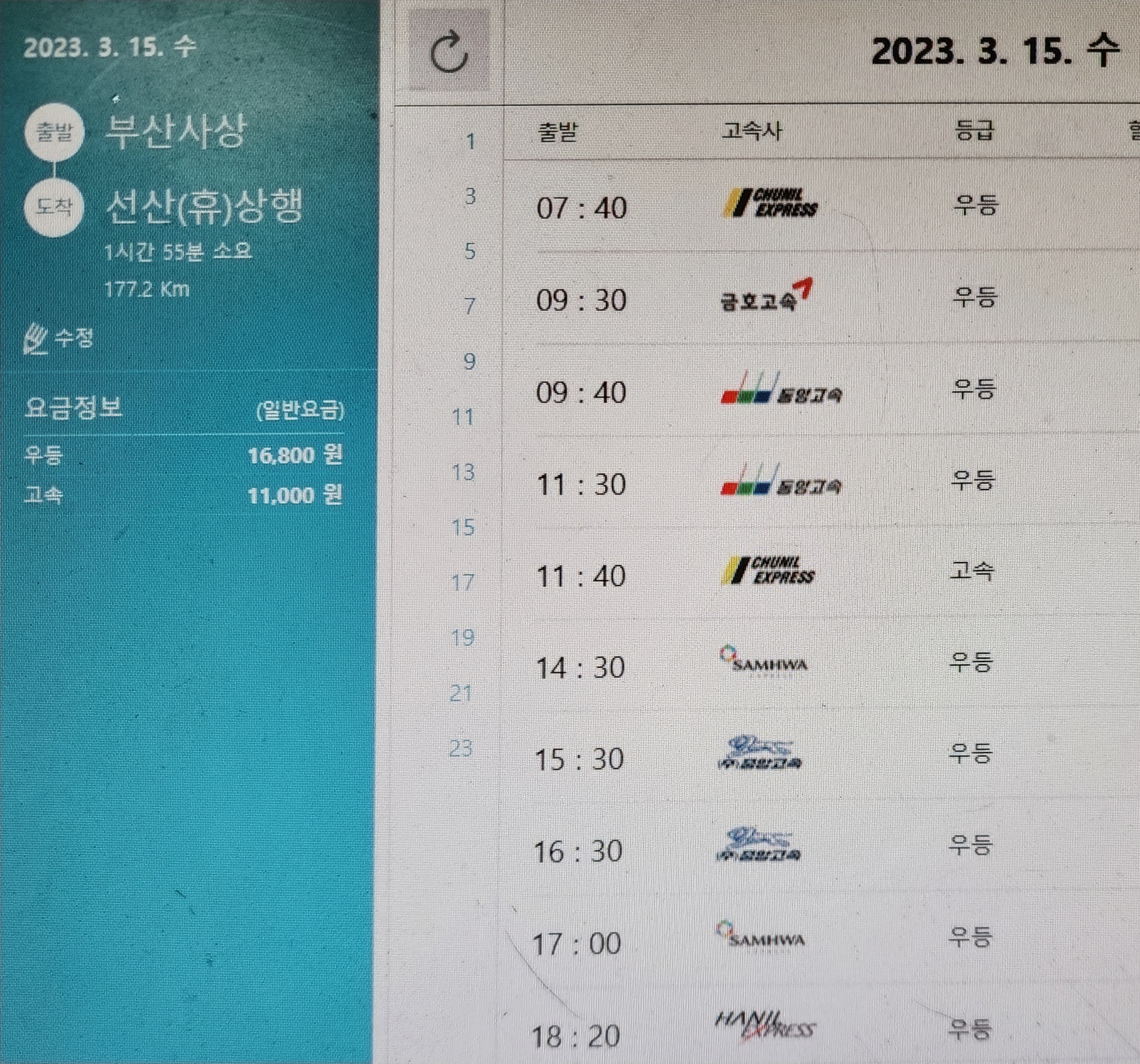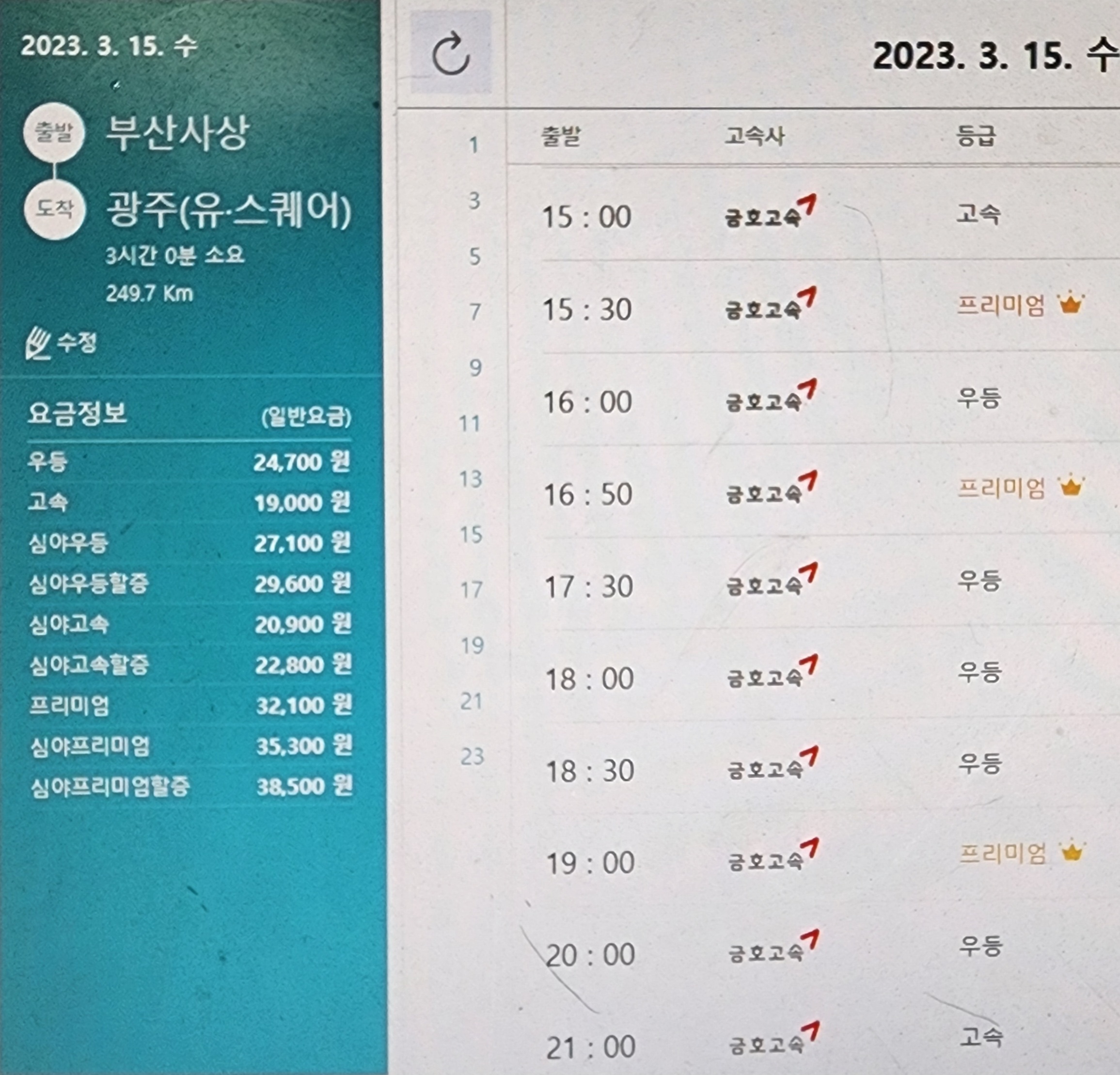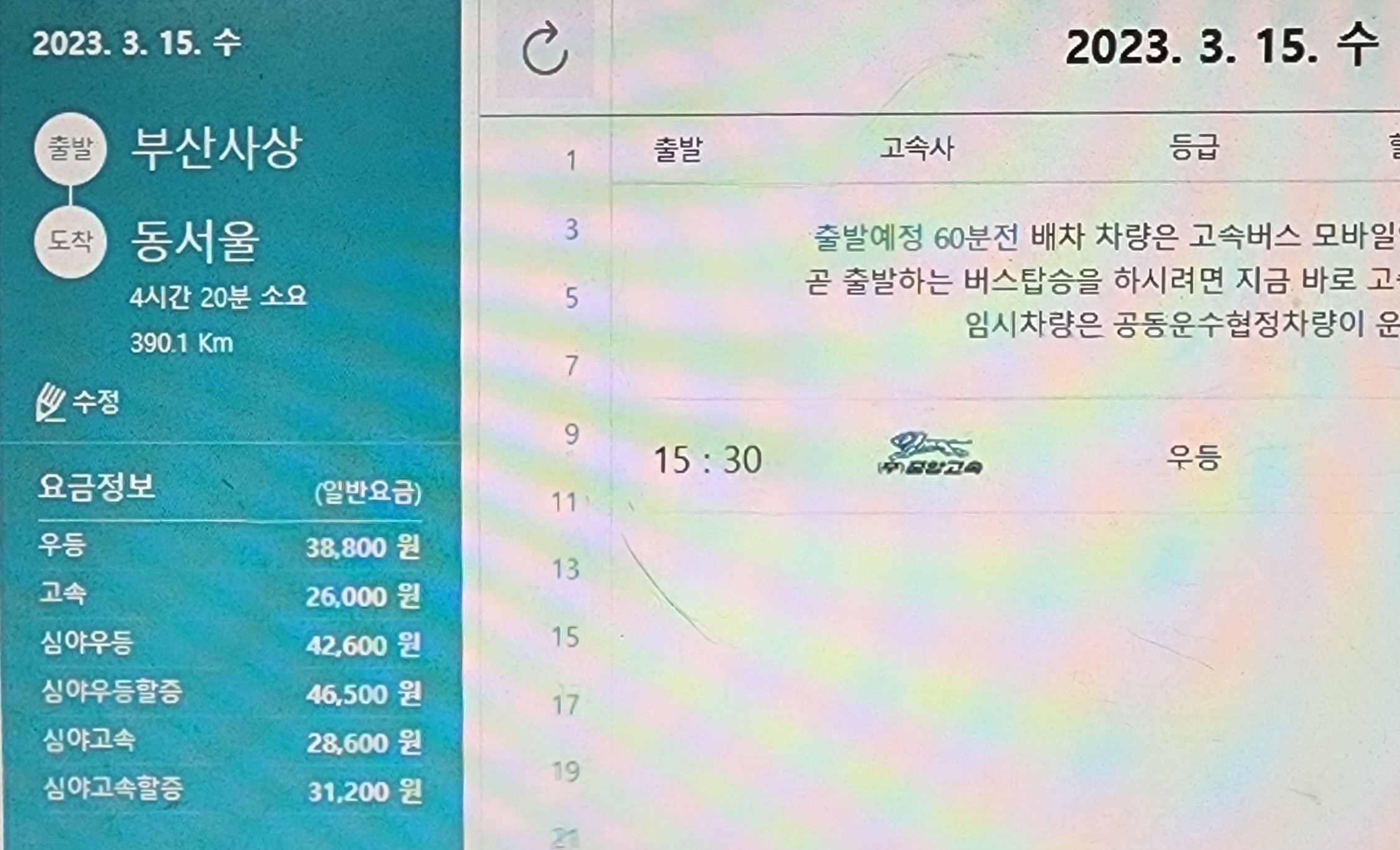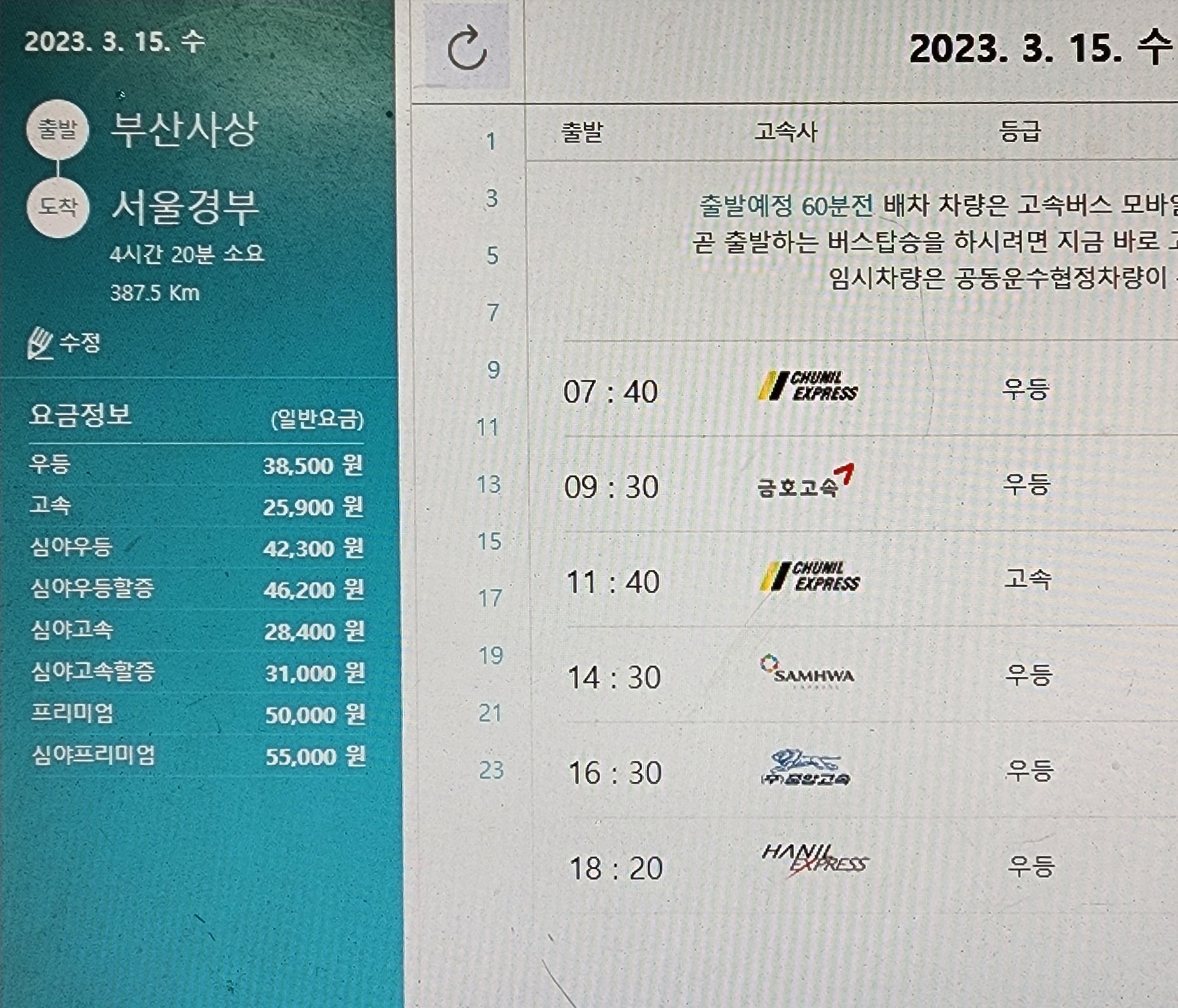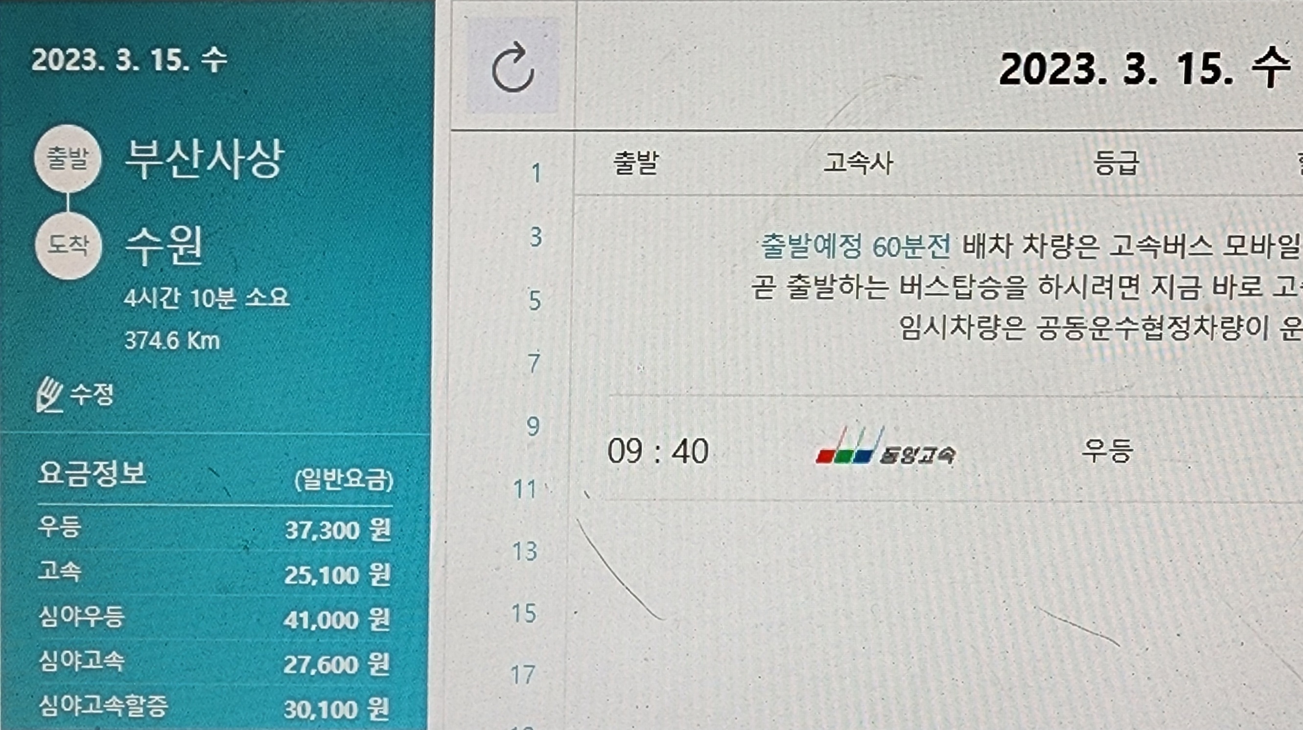 부산 사상~수원 고속버스 시간표 출처: Corbus