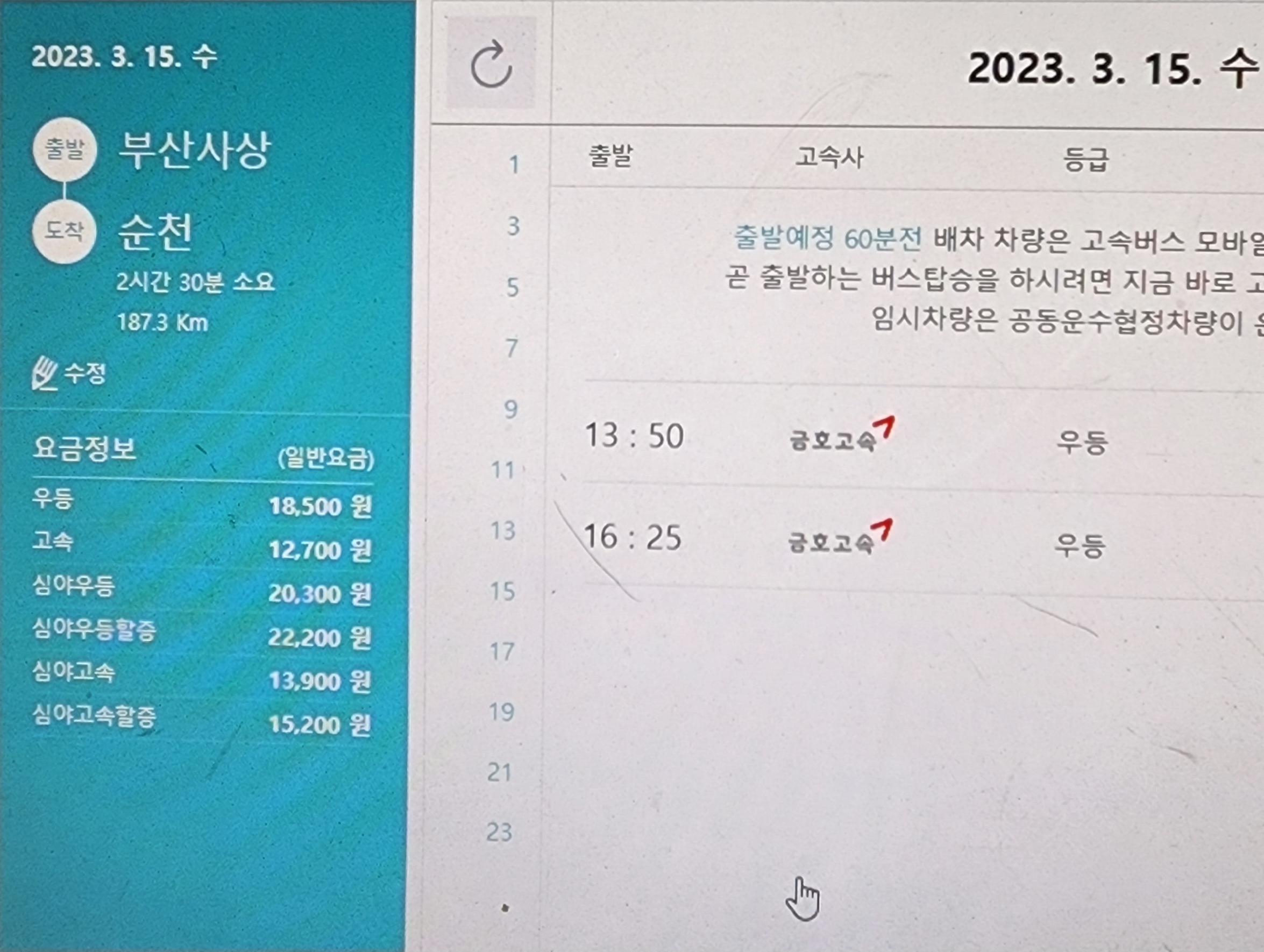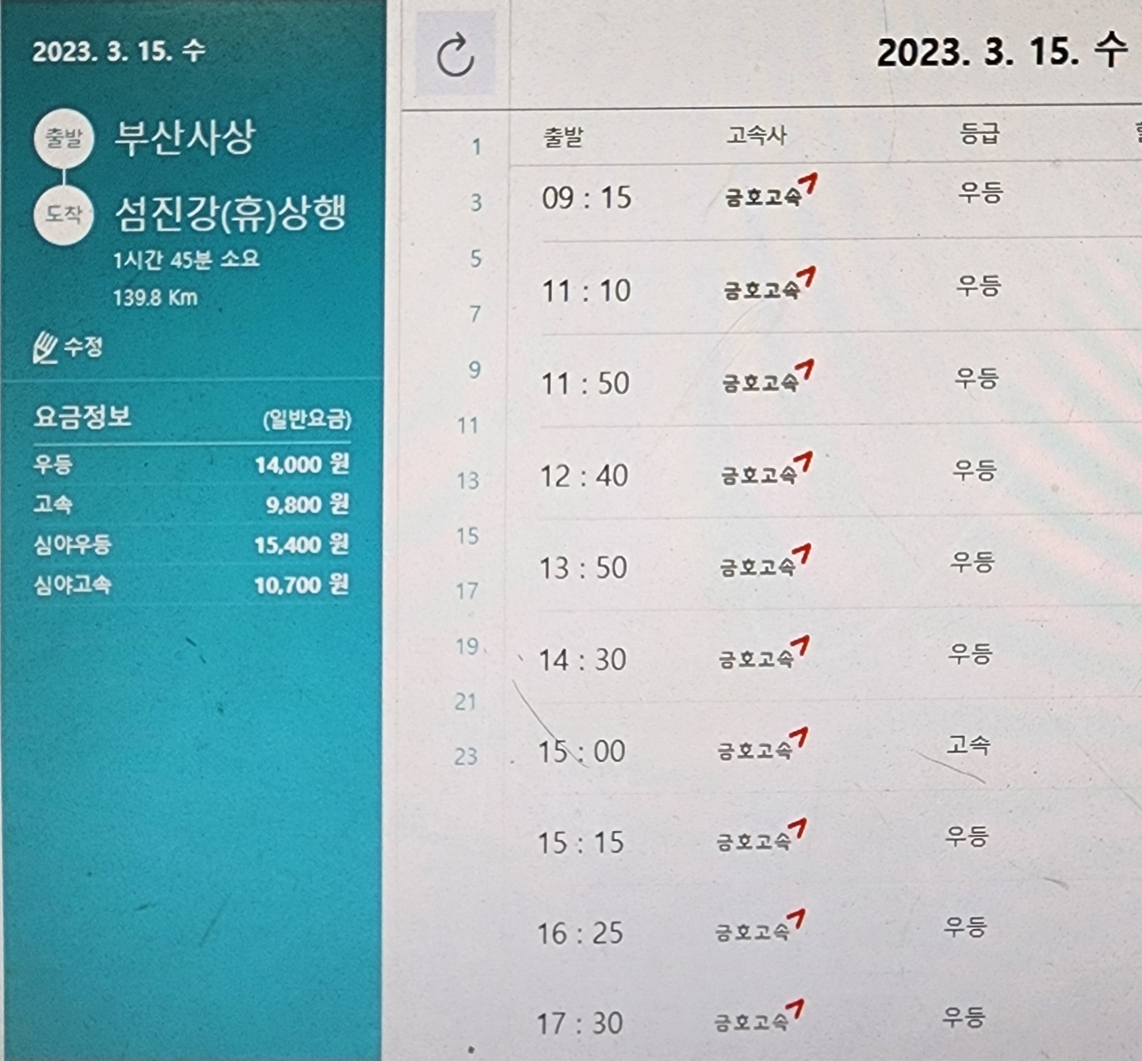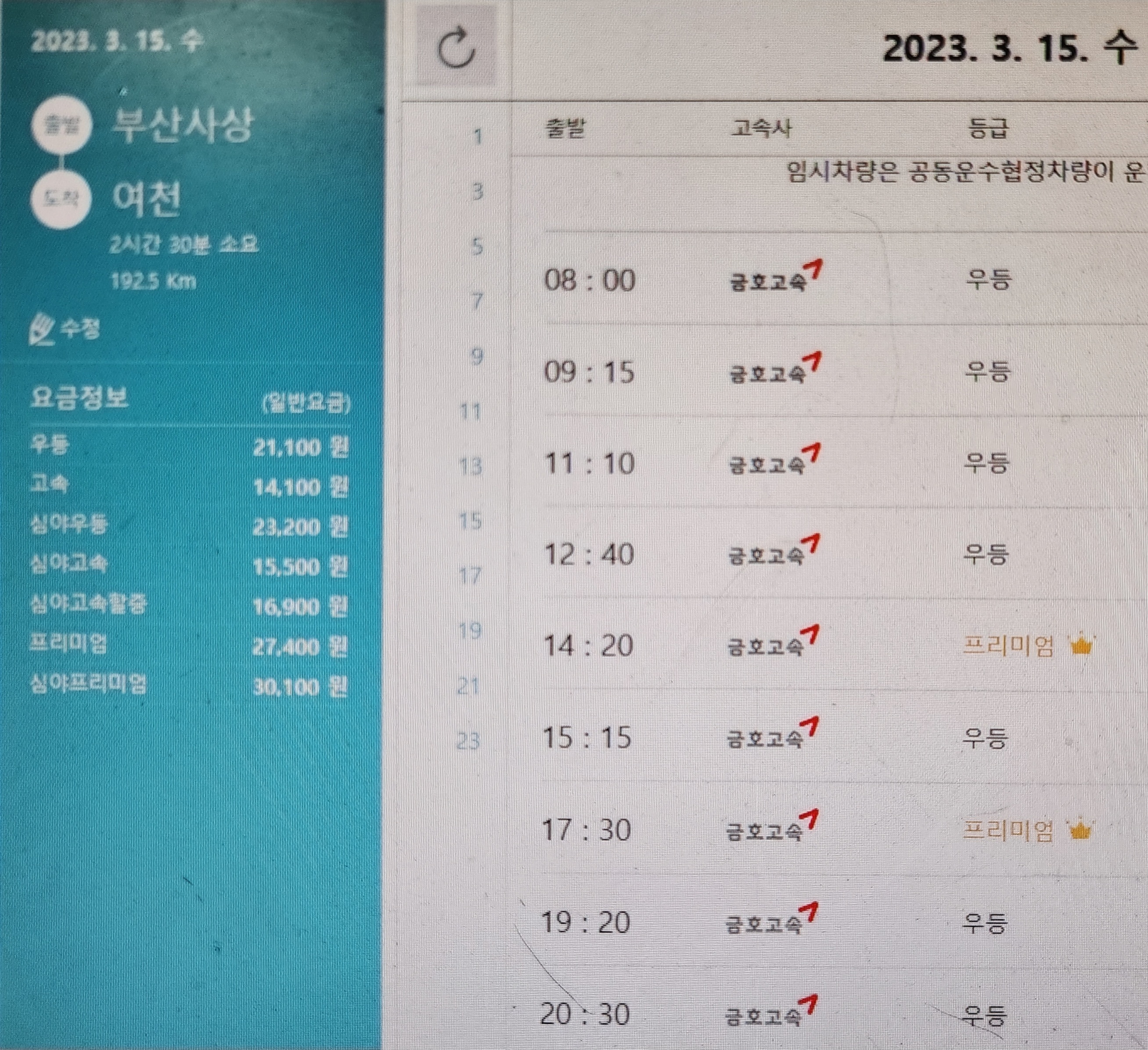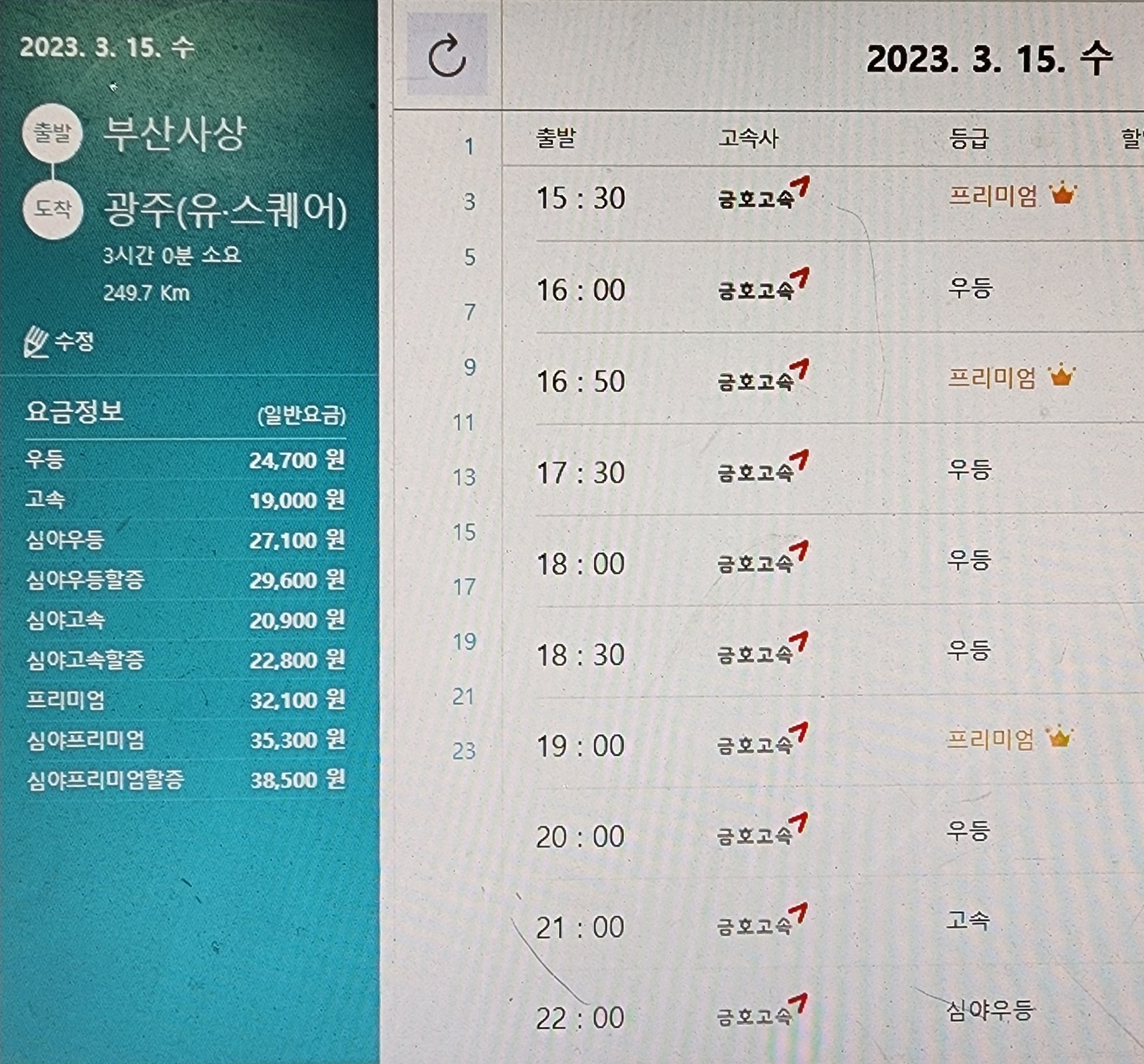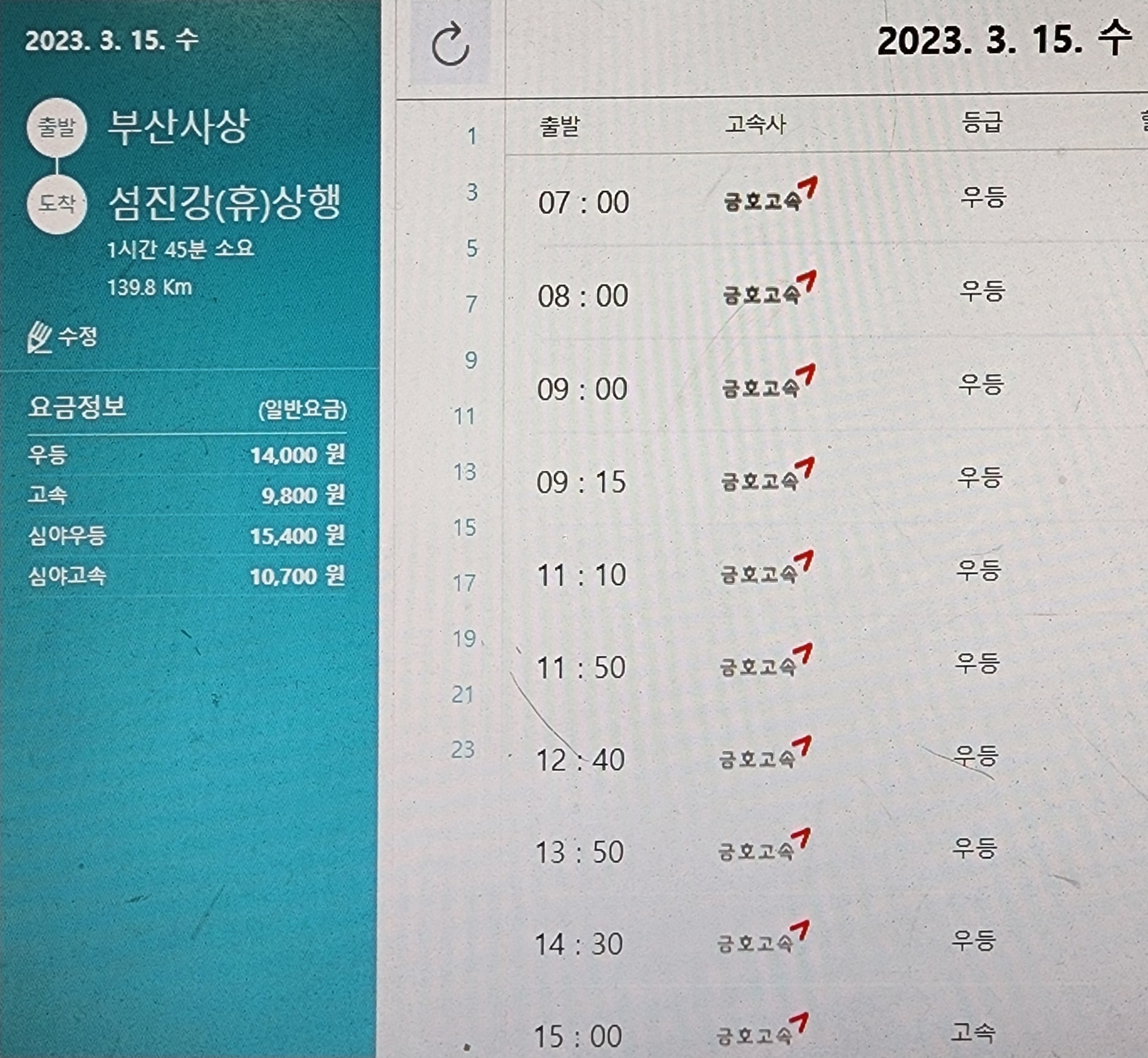 부산 사상~수원 고속버스 시간표 출처: Corbus
