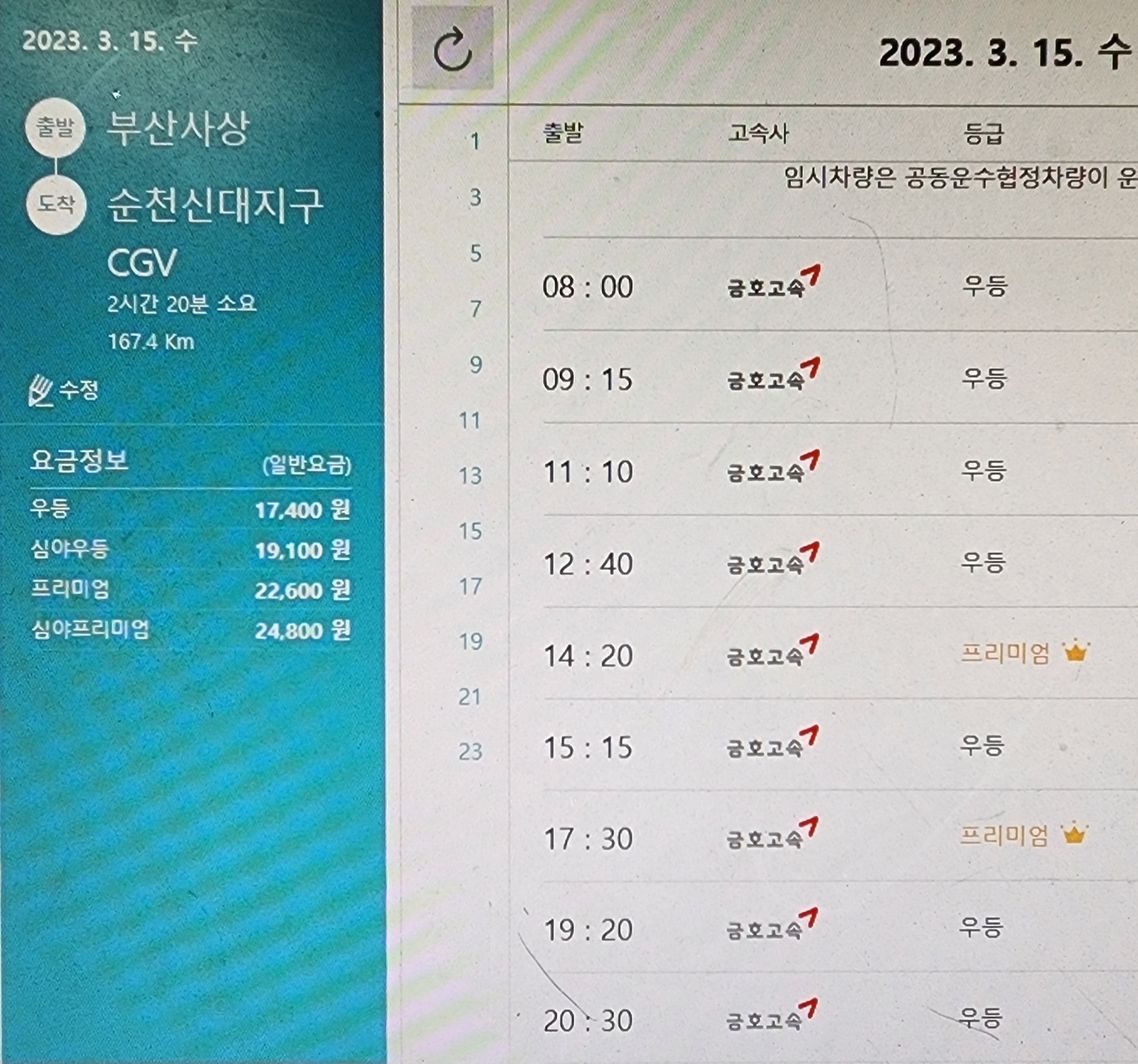 사상에서 순천시티CGV까지 가는 막차 시간표