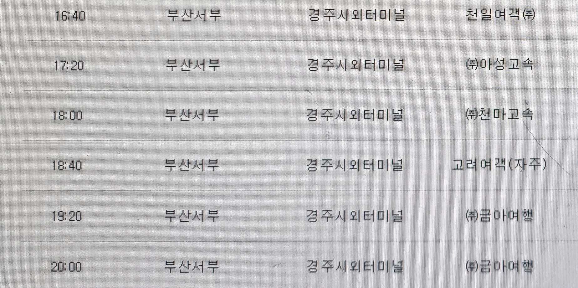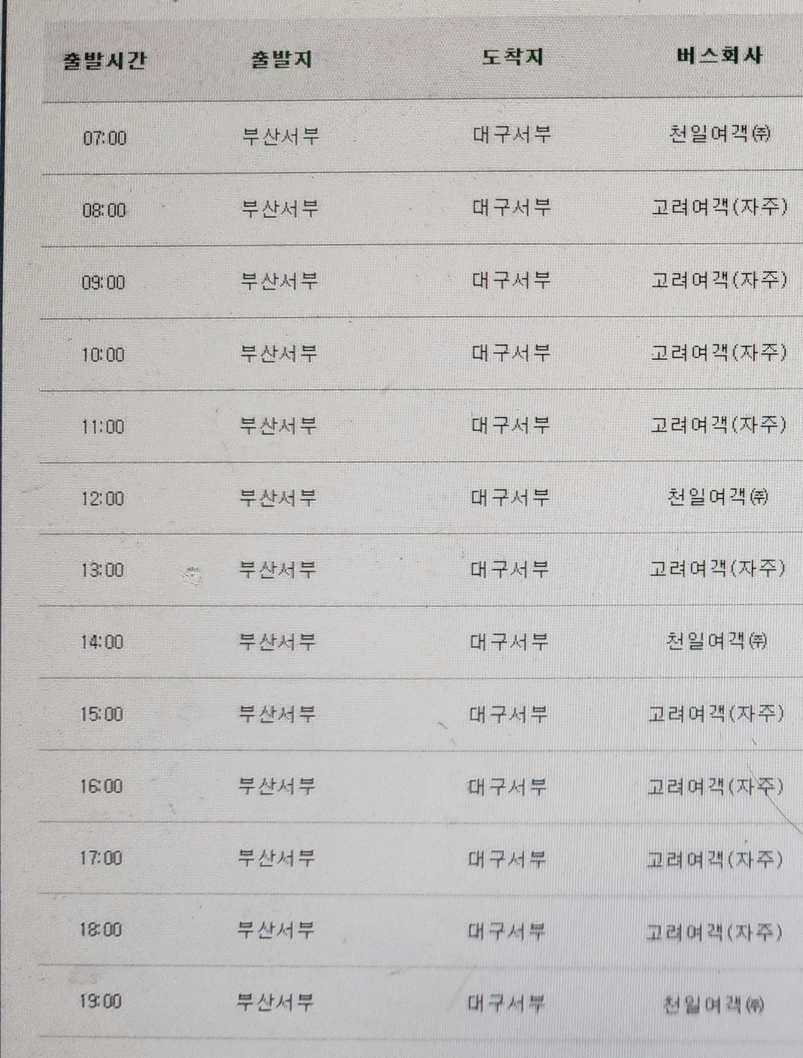 부산서부터미널에서 서울남부터미널 가는 시외버스 시간표