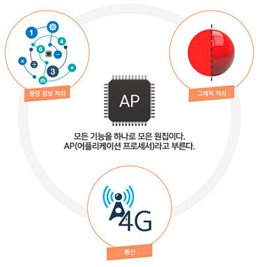 스마트폰 CPU를 AP라고 부르는 이유는 PC CPU와 다릅니다. 주로계산용 CPU, 영상 및 통신 기능용 GPU 등 다른 기능이 하나의 칩에 통합되어 있기 때문에.