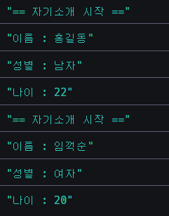console.log("== 자기소개 시작 ==");